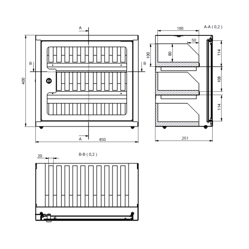 - Innenausstattung: 2 feste Fachböden mit gleichem Abstand, die Fachböden haben eine Tiefe von 190 mm,