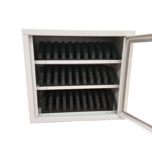 - Schaumstoffeinlagen auf den Regalen und am Boden des Schranks (insgesamt 3 Stück) mit Halterungen für Smartphones, elektrostatisches Schaumstoffmaterial, Farbe Anthrazit, die Kapazität des Schranks beträgt bis zu 30 Smartphones,