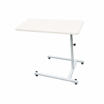 Tisch mit weißer Metallkonstruktion. Gegen Aufpreis kann auch eine andere Gestellfarbe bestellt werden. Die Tischplatte ist höhenverstellbar und an einer Seite mit einer Schutzkante versehen, um das Abrutschen von Gegenständen zu verhindern. Der Rollendurchmesser beträgt 50 mm, 2 Rollen sind mit einer Bremse ausgestattet. Die Platte hat die Maße 900 x 400 mm. Höhenverstellbar im Bereich von 780 – 1050 mm.