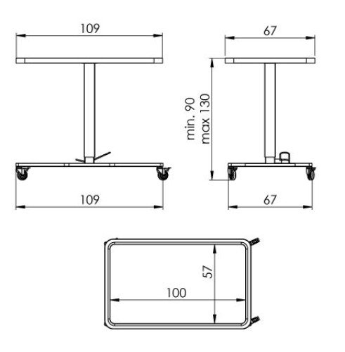 Instrumententisch aus Edelstahl AISI304. Das Innenmaß der Tischfläche beträgt 1000 x 570 mm, mit 12 mm Überstand und einer Tragkraft von 50 kg. Die Tischplatte ist abnehmbar und tragbar. Eine Desinfektion ist mit 130°C heißem Dampf für 3 Minuten möglich. Der Wagen wird in einer antistatischen Ausführung geliefert. Die Höhenverstellung erfolgt über einen Hydraulikkolben, der gegen Flüssigkeitsaustritt gesichert ist. Die Höhe der Tischplatte ist zwischen 900 – 1300 mm verstellbar. Der Tisch ist mit 4 x Kunststoffrädern mit einem Durchmesser von 75 mm mit Bremse ausgestattet.