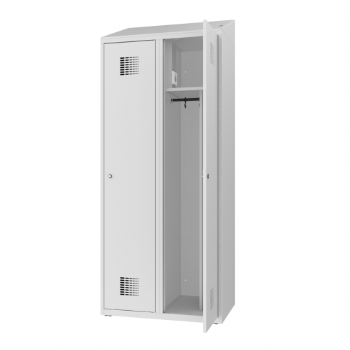 Ein zweitüriger Metallspind mit einem schrägen Dach. Die Oberfläche des Spindes ist mit einer zertifizierten Farbe behandelt, die keine Schwermetalle oder andere schädliche Substanzen enthält. In jedem Fach befindet sich eine Trennwand und eine 230-V-Steckdose mit zwei USB-Anschlüssen. Der Spind eignet sich für den Innenbereich – in Büros, Umkleideräumen, in der Produktion usw. Es können alle elektrischen Geräte wie z.B. Telefone, Laptops und andere Geräte und Werkzeuge aufgeladen werden. Der Spind mit Steckdosen wird mit einer einzigen Zuleitung an das Stromnetz angeschlossen. Das Netzkabel kann elegant an der Rückseite des Spindes verdeckt werden. Mit einer einzigen Zuleitung können maximal 20 Steckdosen in den Spinden mit Strom versorgt werden. Das Modul zur Stromversorgung der Steckdosen, die sich in jedem Fach befinden, befindet sich unter dem schrägen Dach des Spindes. Das Modul enthält: einen Steckdosenadapter mit geerdetem Stecker, eine automatische thermische Sicherung, einen Überspannungsschutz der Klasse III, eine Signalisierungs-LED (leuchtet, wenn die Steckdosen im Spind mit Strom versorgt werden).