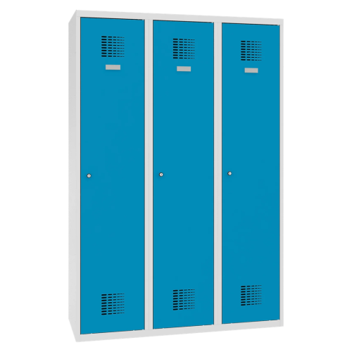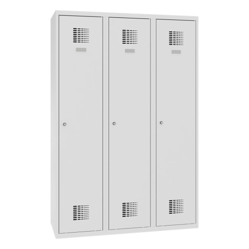 Standard-Metallschrank mit Trennwand im Fach. Die Trennwand ermöglicht die Trennung von Straßen- und Arbeitskleidung. Der Metallschrank aus Stahlblech kann mit 2 Schlüsseln im Set verschlossen werden. Das Innenzubehör: ein Regal im oberen Teil, darunter eine Kleiderstange - mit 2 Haken, selbstklebender Spiegel, Typenschildhalter und Kleiderbügel.