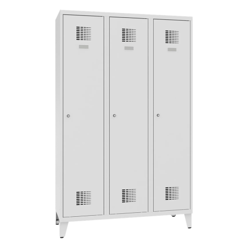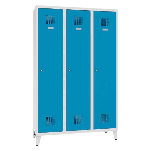 Metallschrank mit Standardbeinen. Der Metallschrank aus Stahlblech kann mit 2 Schlüsseln im Set verschlossen werden. Das Innenzubehör: ein Regal im oberen Teil, darunter eine Kleiderstange - mit 2 Haken, selbstklebender Spiegel, Typenschildhalter und Kleiderbügel.