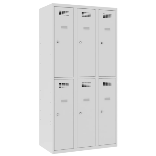 Standard-Kleiderschrank aus Metall mit kurzen Türen. Der Metallspind aus Stahlblech ist mit 2 Schlüsseln im Set abschließbar. Das Innenzubehör: Kleiderbügelstange im oberen Teil – mit 2 Haken, selbstklebender Namensschildhalter.