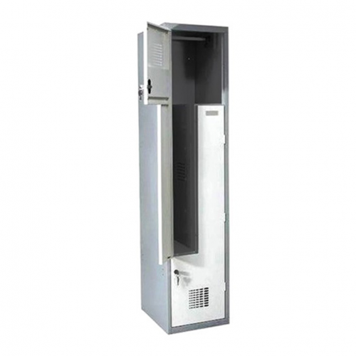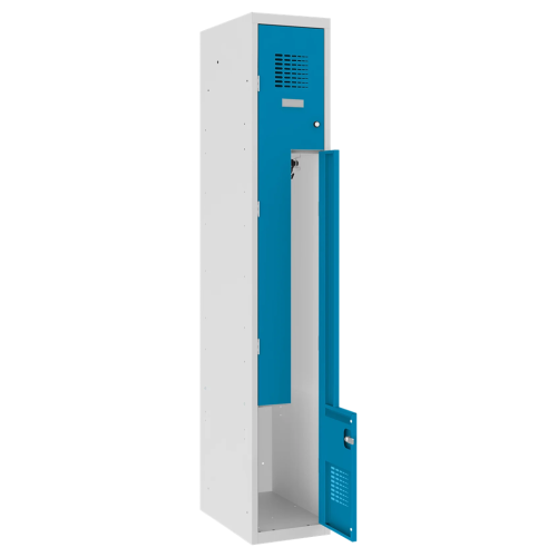 Standard Metallschließfach mit Z-Tür bzw. mit L-Tür und 2 Schlüsseln für jede Tür im Set. Mit Belüftungsöffnungen an allen Türen und selbstklebendem Typenschildhalter. Der Kleiderschrank spart Platz und eignet sich auch zur Aufbewahrung langer Mäntel.