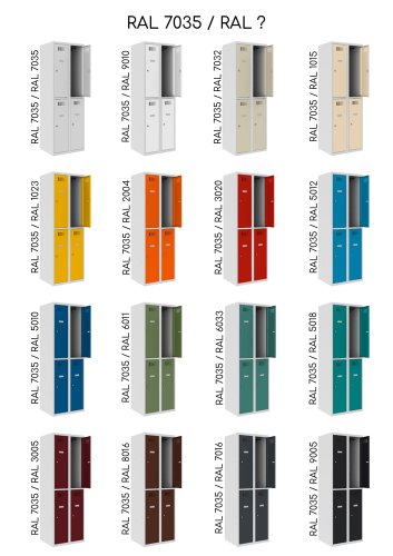 Standard Metall- Umkleideschrank mit kurzen Türen. Das Metallfach aus Stahlblech kann mit 2 Schlüsseln im Set verschlossen werden. Innenausstattung: Kleiderstange im Oberteil - mit 2 Haken, selbstklebender Typenschildhalter.