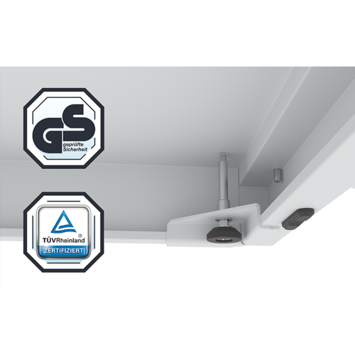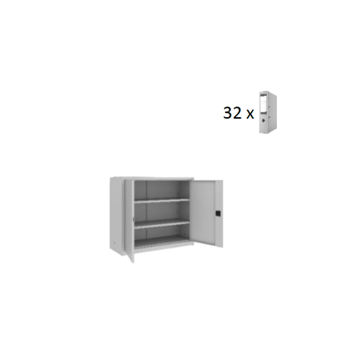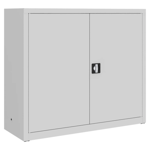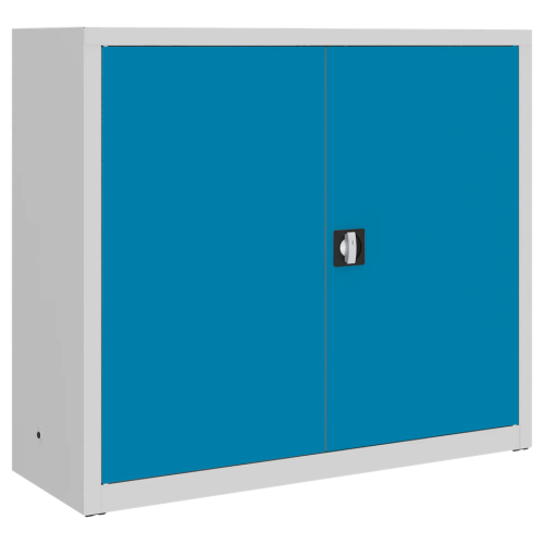Abschließbarer Regalschrank aus Metall mit Schwingtüren, 1040 x 1200 x 435 mm. Der Schrank wird mit 2 Schlüsseln und 4 Regalen geliefert. Die Regale können stufenweise um je 25 mm verstellt werden.
