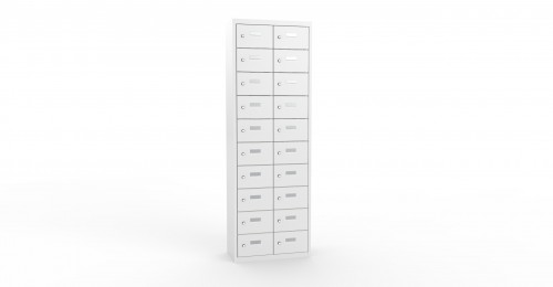 Wertfachschrank aus Metall mit kleinen Fächern. Geeignet für die Aufbewahrung kleiner Gegenstände wie Geldtasche oder Handy. Kann als Snackschrank verwendet werden - um die Kleinigkeiten der Mitarbeiter am Arbeitsplatz zu bewahren. Mit 2 Schlüsseln für jede Schranktür.