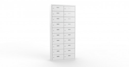 Wertfachschrank aus Metall mit kleinen Fächern. Geeignet für die Aufbewahrung kleiner Gegenstände wie Geldtasche oder Handy. Kann als Snackschrank verwendet werden - um die Kleinigkeiten der Mitarbeiter am Arbeitsplatz zu bewahren. Mit 2 Schlüsseln für jede Schranktür.