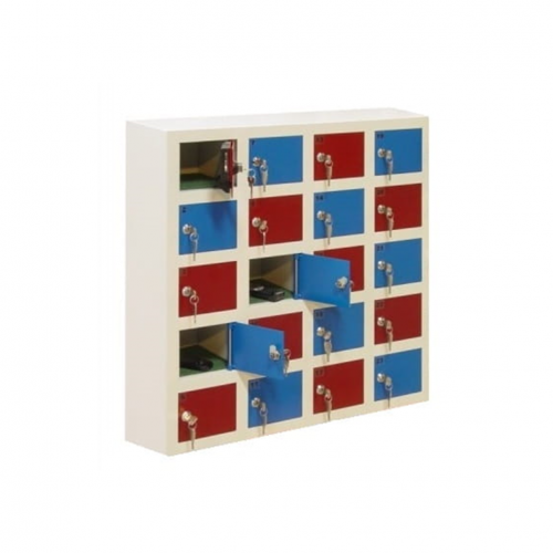 Wertfachschrank aus Metall mit kleinen Fächern. Geeignet für die Aufbewahrung kleiner Gegenstände wie Geldtasche oder Handy. Im Inneren des Fachs mit Stofffutter versehen, das die gelagerten Gegenstände vor Kratzern schützt. Für jede Schranktür mit 2 Schlüsseln und Nummerierung an den Türen auf Anfrage.
